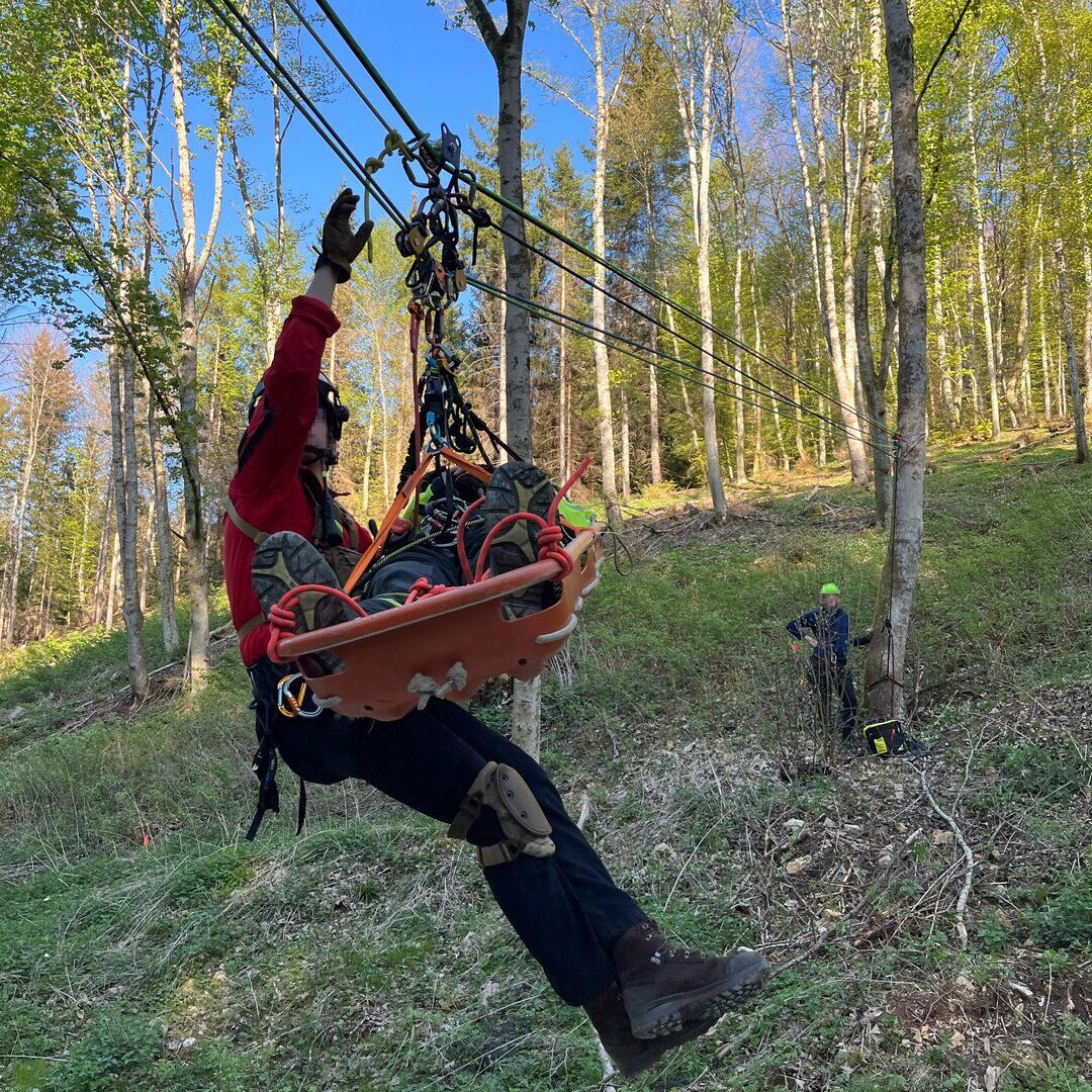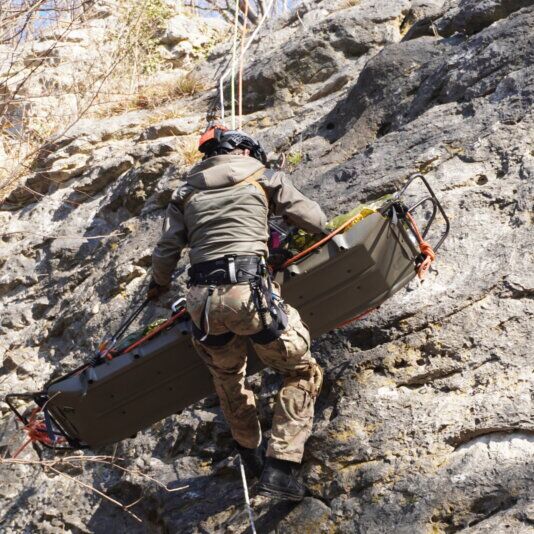 High Angle Rescue bezeichnet Rettungen an Hängen mit einer Neigung zwischen 45° und 60°. In diesem Bereich reicht der Bodenkontakt nicht mehr aus, um das Gewicht von Retter und Patient zu tragen – stattdessen übernehmen Seile den Großteil der Last. Ein symmetrisches Zwei-Seil-System ist zwingend erforderlich um die Last gleichmäßig aufzuteilen und Redundanzen für den Fall eines Systemversagens zu schaffen. Nur in Ausnahmefällen, etwa bei sofortigem Zugang zum Patienten, wird kurzzeitig mit nur einem Seil gearbeitet.